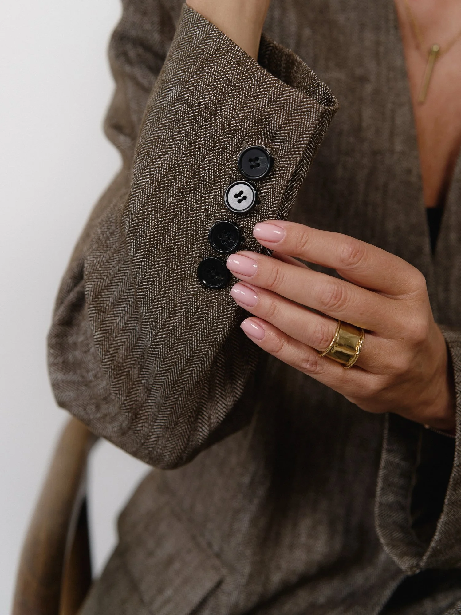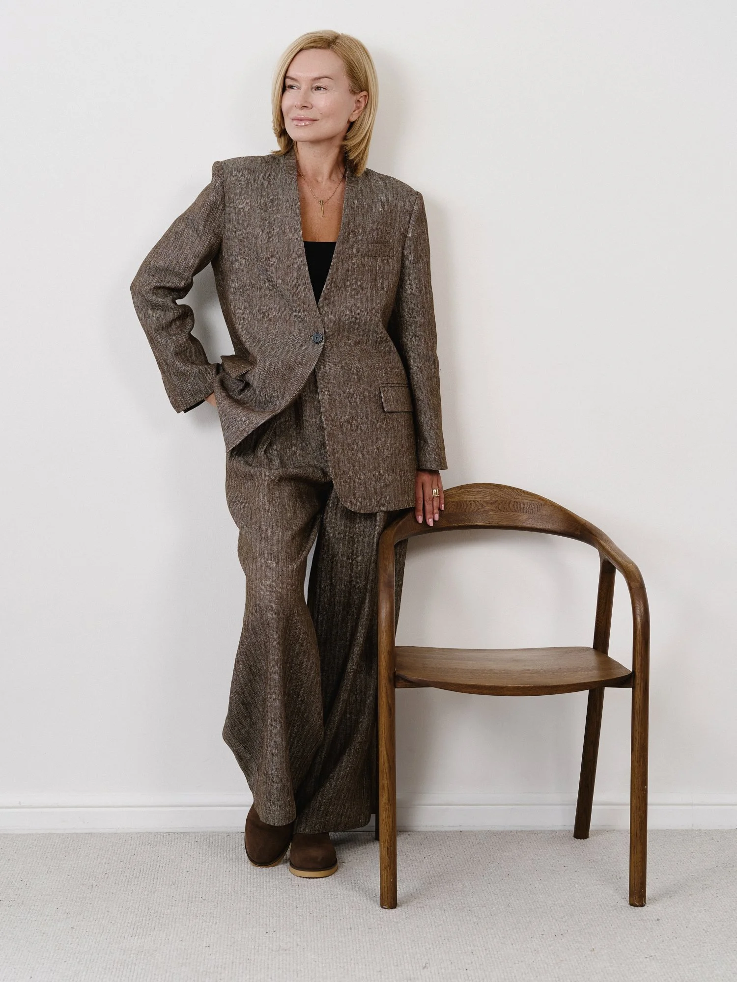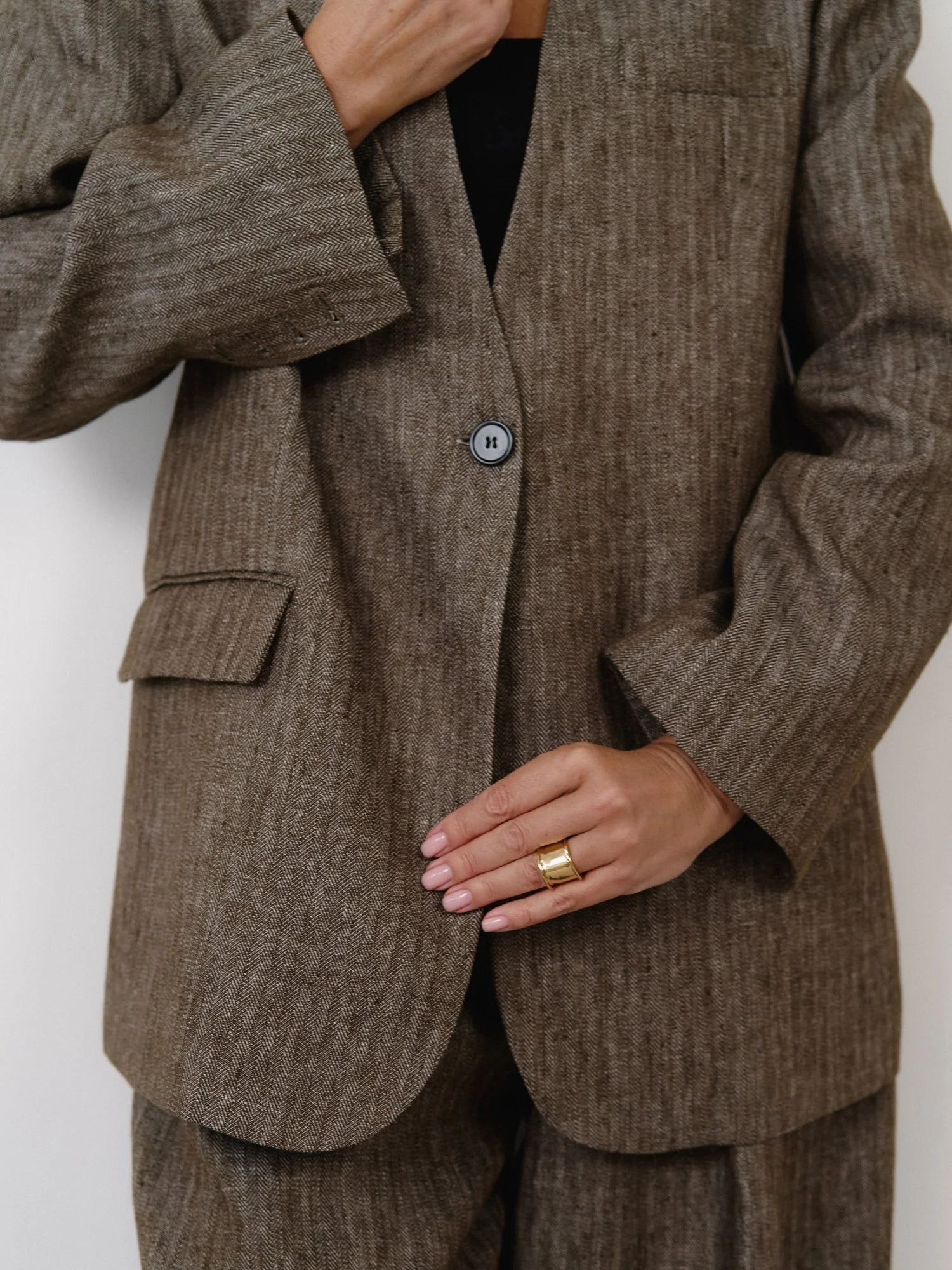 Пиджак без воротника цв.коричневый , рис. елочка S