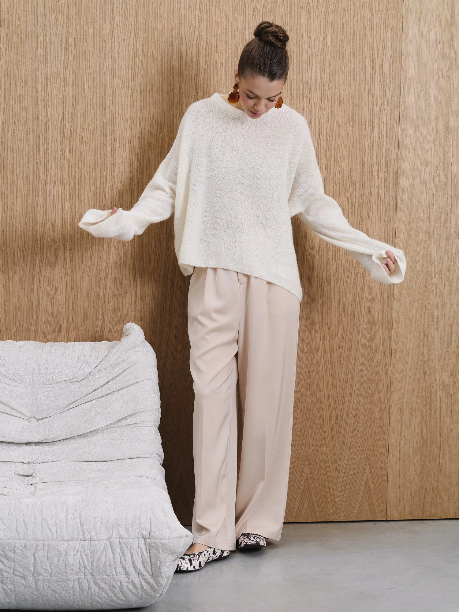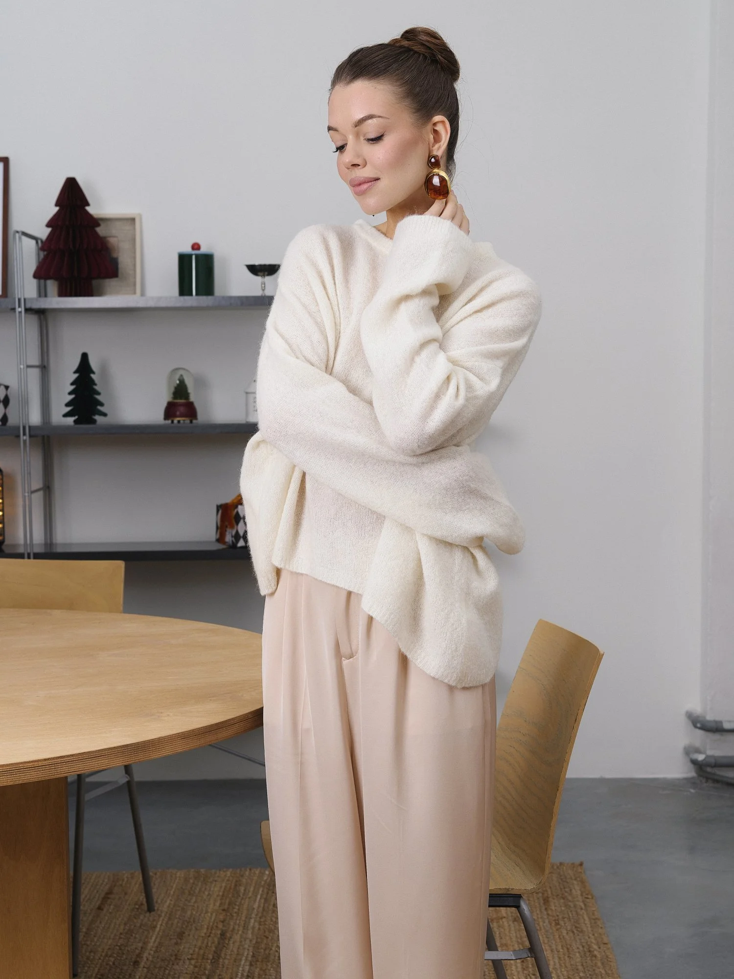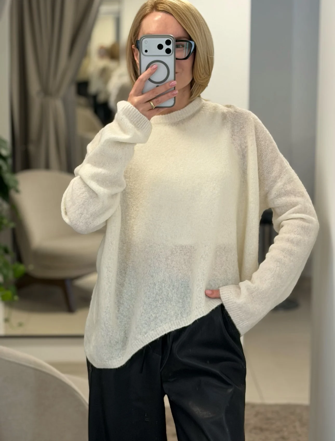 Свободный oversize силуэт и спущенная линия плеча делают этот свитер идеальной базой для современных многослойных образов. • Текстура: нежная, «пушистая» вязка с эффектом прозрачности. • Цвет: благородный Ivory (молочный). • Детали: удлиненные рукава и лаконичная горловина подчеркивают расслабленность образа в стиле «casual chic».