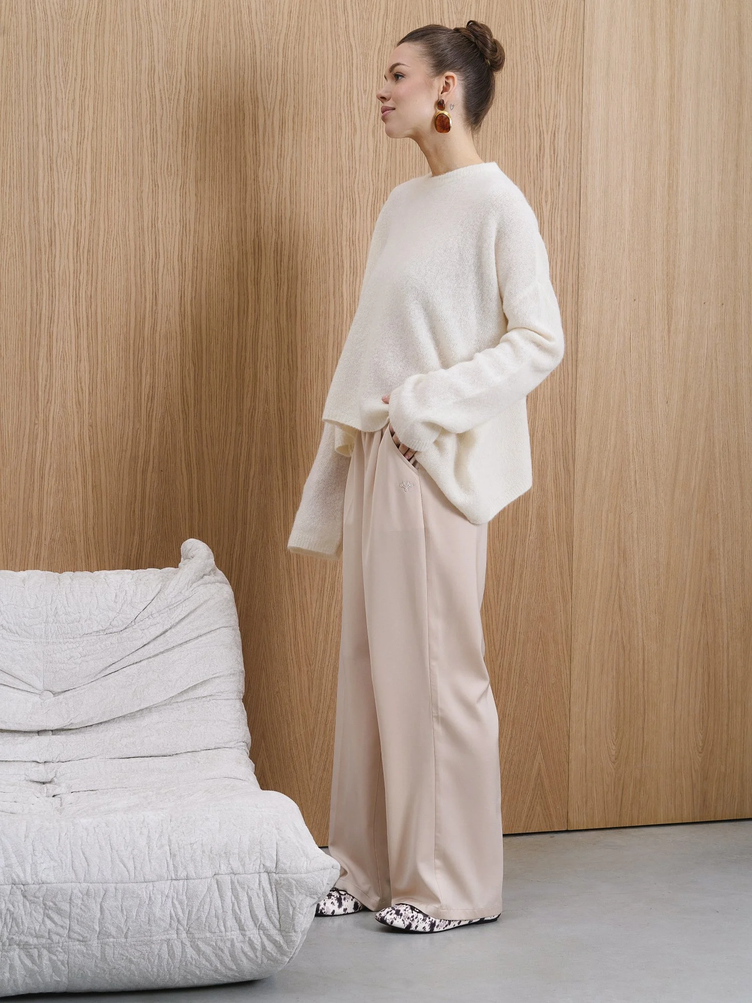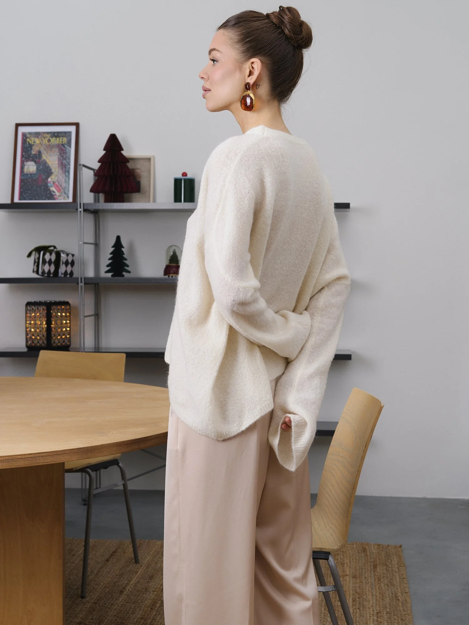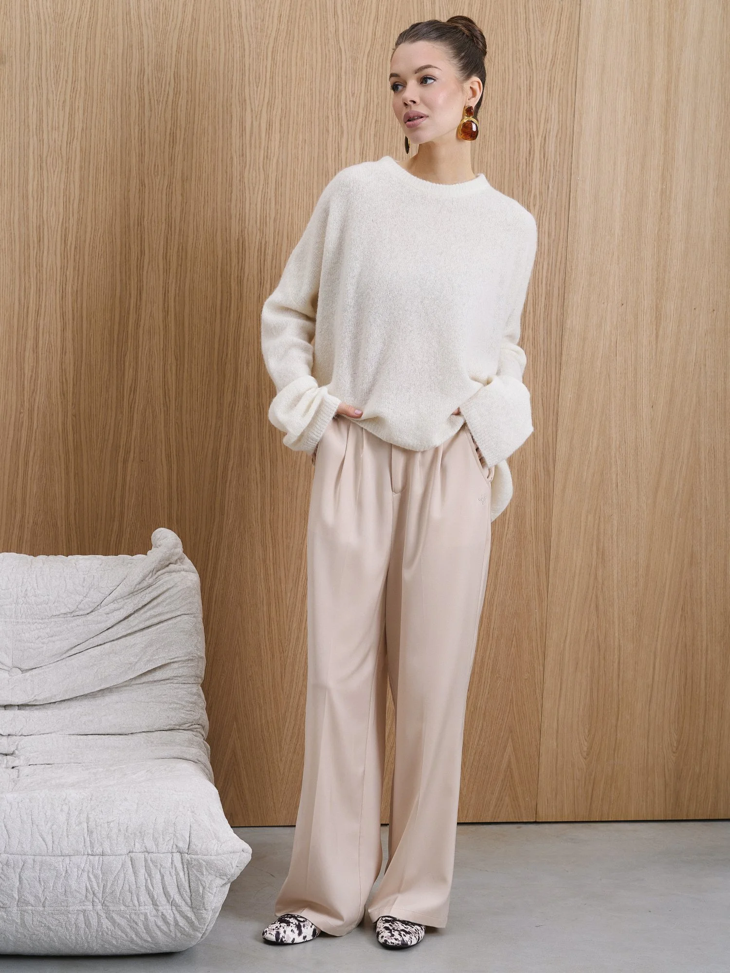Свободный oversize силуэт и спущенная линия плеча делают этот свитер идеальной базой для современных многослойных образов. • Текстура: нежная, «пушистая» вязка с эффектом прозрачности. • Цвет: благородный Ivory (молочный). • Детали: удлиненные рукава и лаконичная горловина подчеркивают расслабленность образа в стиле «casual chic».