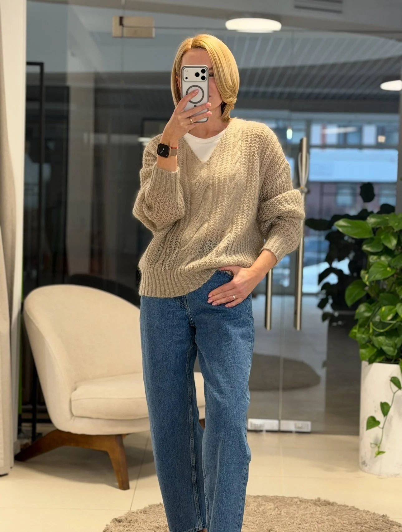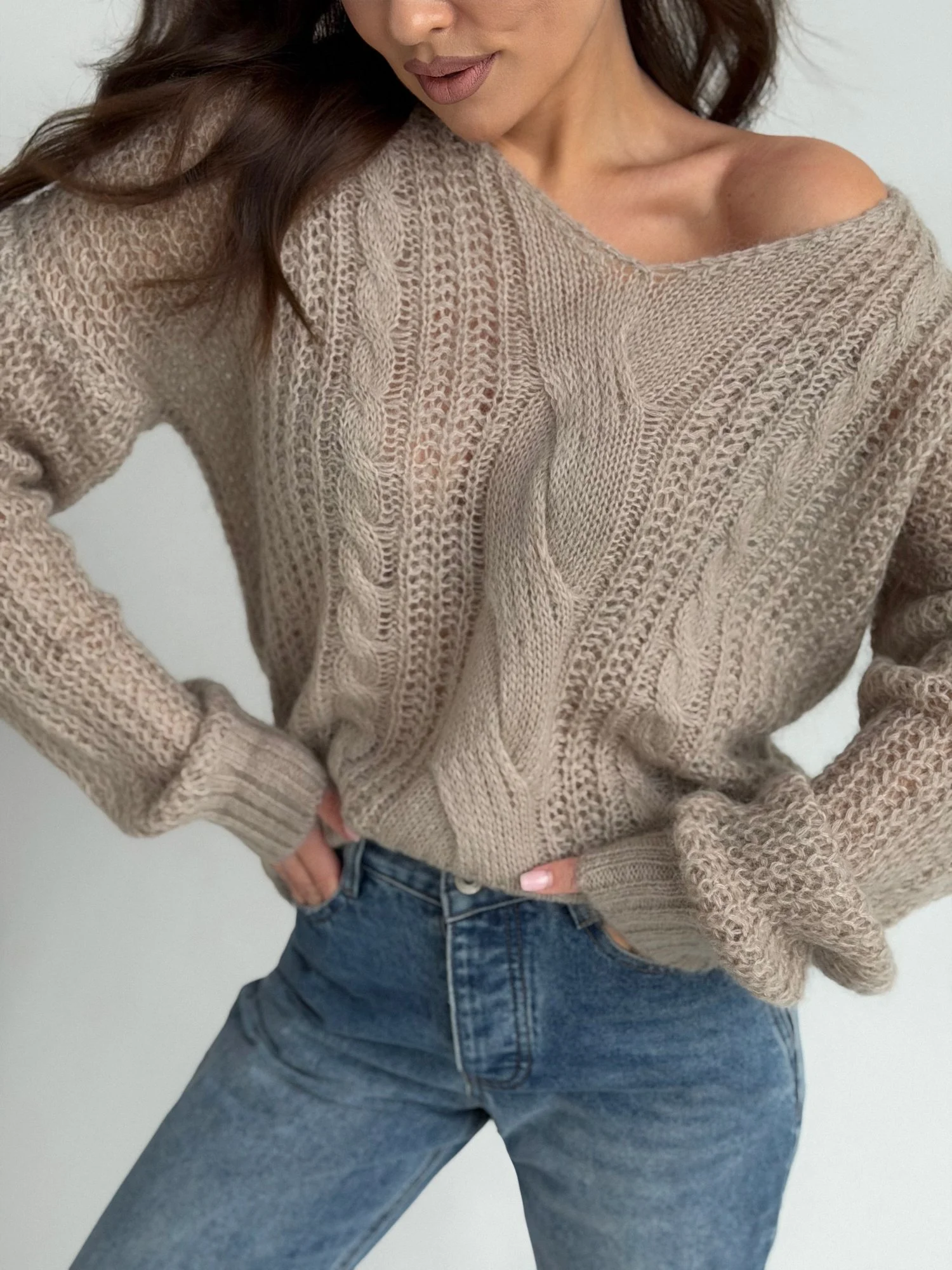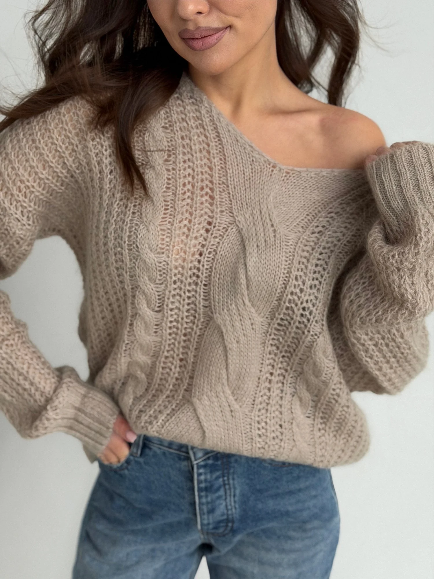 Крупная, «воздушная» вязка с изящными косами V-образный вырез деликатно подчеркивает линию шеи Актуальный природный оттенок - тауп Нежнейшая шерсть беби альпак .Не колется!
